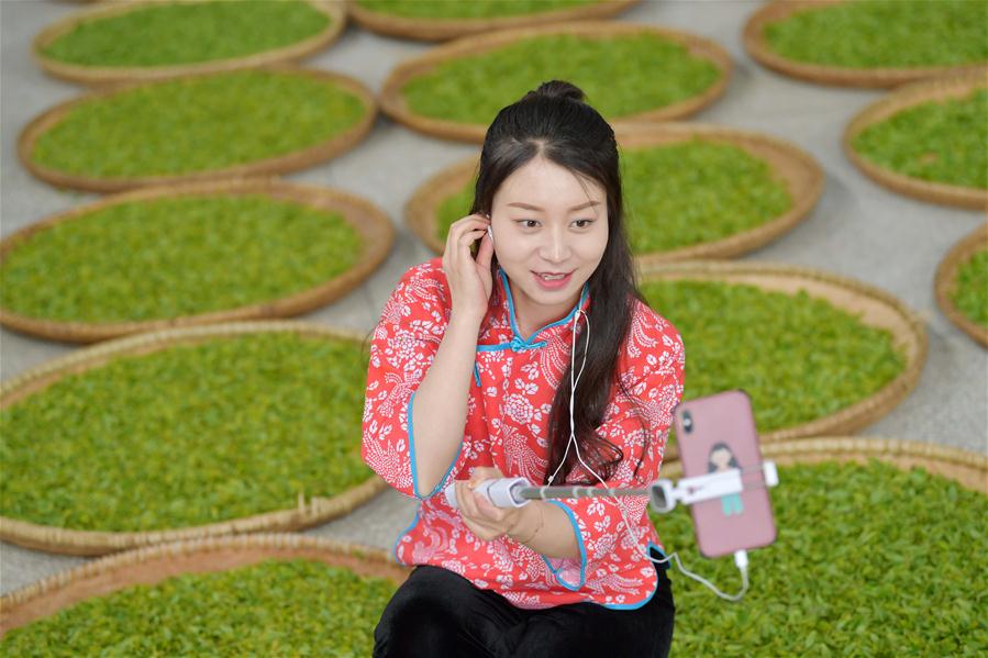 4月8日,鹤峰县鑫农茶业有限公司工作人员通过直播介绍茶叶。 为促进湖北省鹤峰县40万亩生态茶园的茶叶销售,近日,当地多家茶企积极与电商平台对接,通过直播的方式,向消费者直观呈现茶叶采摘到生产制作的全过程,助力“带茶出山”,帮助茶农脱贫增收。 新华社发(杨顺丕摄)