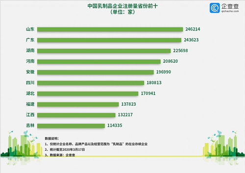 企查查专业版数据显示,我国目前共有乳制品企业447万家,其中在业、存续的企业共321万家。从地域分布来看,全国范围内山东省和广东省乳制品企业注册量最多,皆为24万余家,湖南、河南次之。