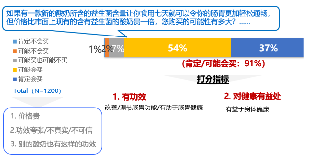 如何让消费者信赖你的产品,相信你的活菌有明显的功能,我们通过消费者调研发现,让消费者产生直接的具有身体反应的体感是核心,就像用了海飞丝头屑少了,喝了红牛精神了,那么喝了有活菌的发酵乳同样要有肠道通畅的感觉,在我们的调研测试中,有95%以上的消费者愿意为宣称有体感的益生菌酸奶进行尝试。