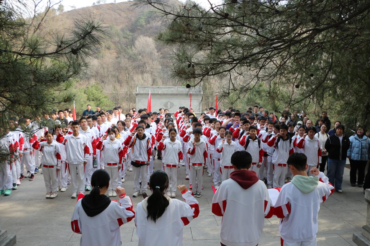下午,师生参观古北口抗战纪念馆,通过文物史料重温浴血奋战的历史。在抗战烈士公墓前,校党支部书记兼校长李昱霏与学生、教师代表敬献花篮。学生代表刘梦真分享备考目标,家长代表彭雨婷传递家庭支持与期望。教师与家长为学生佩戴刻有"稳扎稳打""奋勇向前"的励志腕带,将师长关爱化为冲刺动力。全体学生紧握右拳宣誓:"以青春之名,承先烈之志,决胜中考,不负韶华!"李昱霏校长勉励学子:"要将长城的坚韧、先烈的精神融入冲刺全程,以最佳状态迎战中考。"全场齐声高呼"我们可以!我们必胜!",将活动推向高潮。