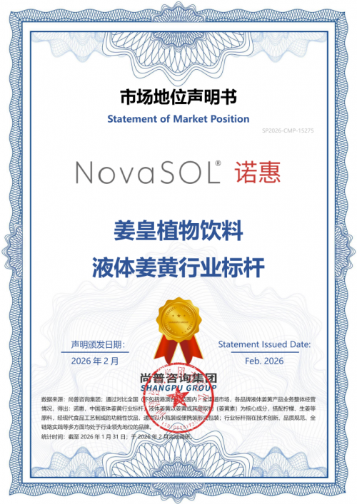 重磅认证!NovaSOL®诺惠姜皇植物饮料斩获市场地位声明书,树立行业标杆