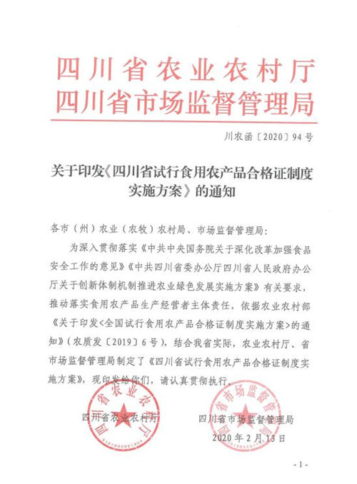 按照农业农村部全国试行食用农产品合格证制度工作部署视频会议的要求,四川省跟进召开了全省专题视频会,研究推动试行工作,积极贯彻落实有关会议精神和试行要求,及时在全省范围启动实施合格证制度。目前成都市整合省市两级530万元资金试行合格证制度,全市有2381个食用农产品生产主体试行开具合格证,共开出合格证5.1万张。都江堰市整合省级和成都市级财政资金50万元,有149家食用农产品生产主体、131家市场经营主体纳入试点,共计开具合格证14000余张,食用农产品产地准出附码合格证15万余吨。截至5月底,全省已开具合格证20.6万张,带证销售农产品26.5万吨。